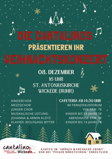 Am 08. Dezember 2019 wird endlich unser eigenes Adventskonzert in der St. Antoniuskirche Wickede stattfinden. Wir freuen uns, die Sopranistin Anna Nächster und die Pianistin Valentina Wekesser als mitwirkende Gäste begrüßen zu dürfen und unseren Zuhörern einen adventlichen, ruhigen Abend mit anspruchsvollen musikalischen Beiträgen bieten zu können. Bereits ab 15 Uhr laden wir zu Kaffee und Kuchen in das Fransiskus Forum ein, Konzertbeginn ist um 17 Uhr. Karten können im Grünen Warenhaus, bei Picker und bei allen Chormitgliedern erworben werden. Wir freuen uns auf zahlreiche Besucher und einen schönen Abend!